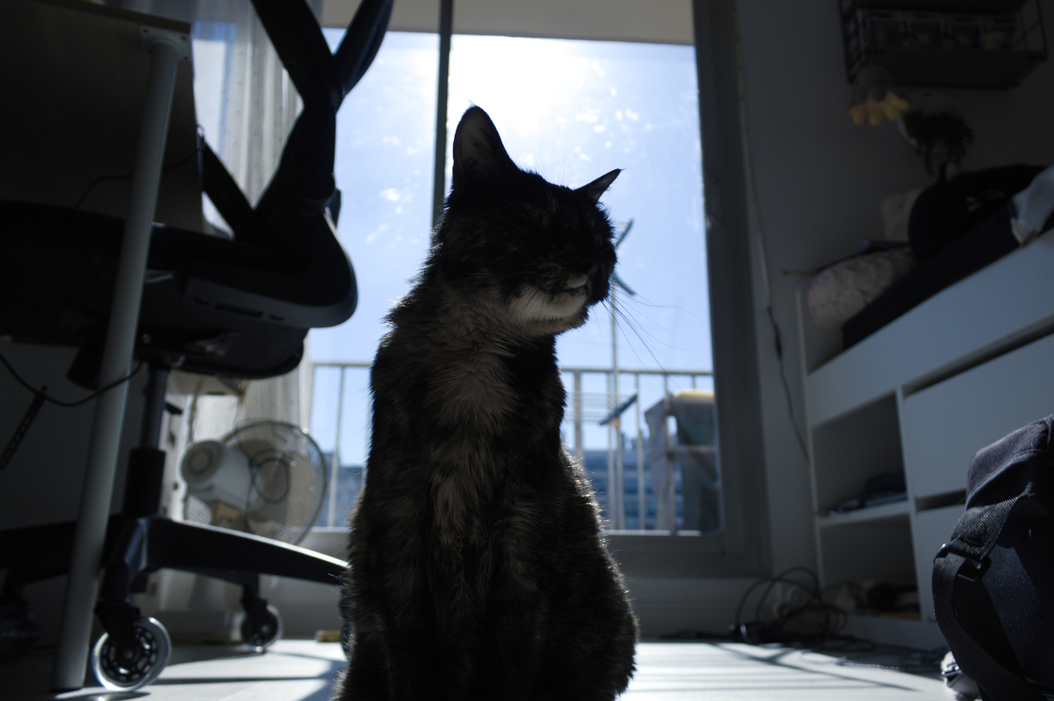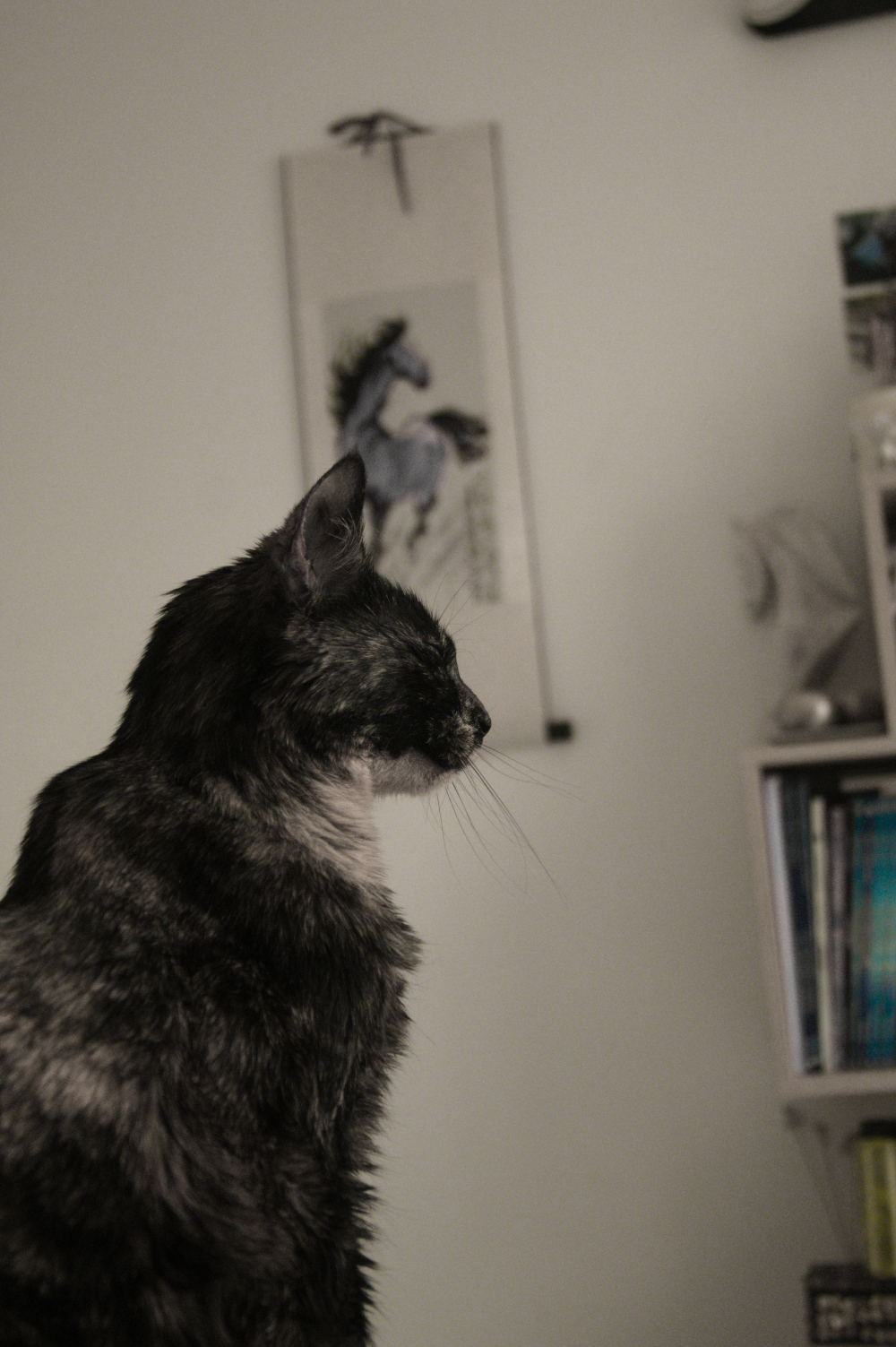 Charlotte, ma chatte, a eu 18 ans cette année, et la vie n’est pas toujours très simple. Nous partageons le même environnement, marchons sur le même sol et pourtant, nous sommes différentes : sa perception des couleurs, le fait qu’elle marche à quatre pattes, sa dépendance à l’être humain malgré qu’elle soit dans son environnement, son ennui parfois. C’est donc cette approche que j’ai voulu favoriser dans mon projet, montrer ce qu’elle voit, ce qu’elle ressent, certains de ses problèmes (comme par exemple l’éternel problème des portes ou des fenêtres fermées, comme tous les chats…), mais surtout sa perception des couleurs qui est bien différente de la nôtre : et oui, ces photos sont purement de SON point de vue !